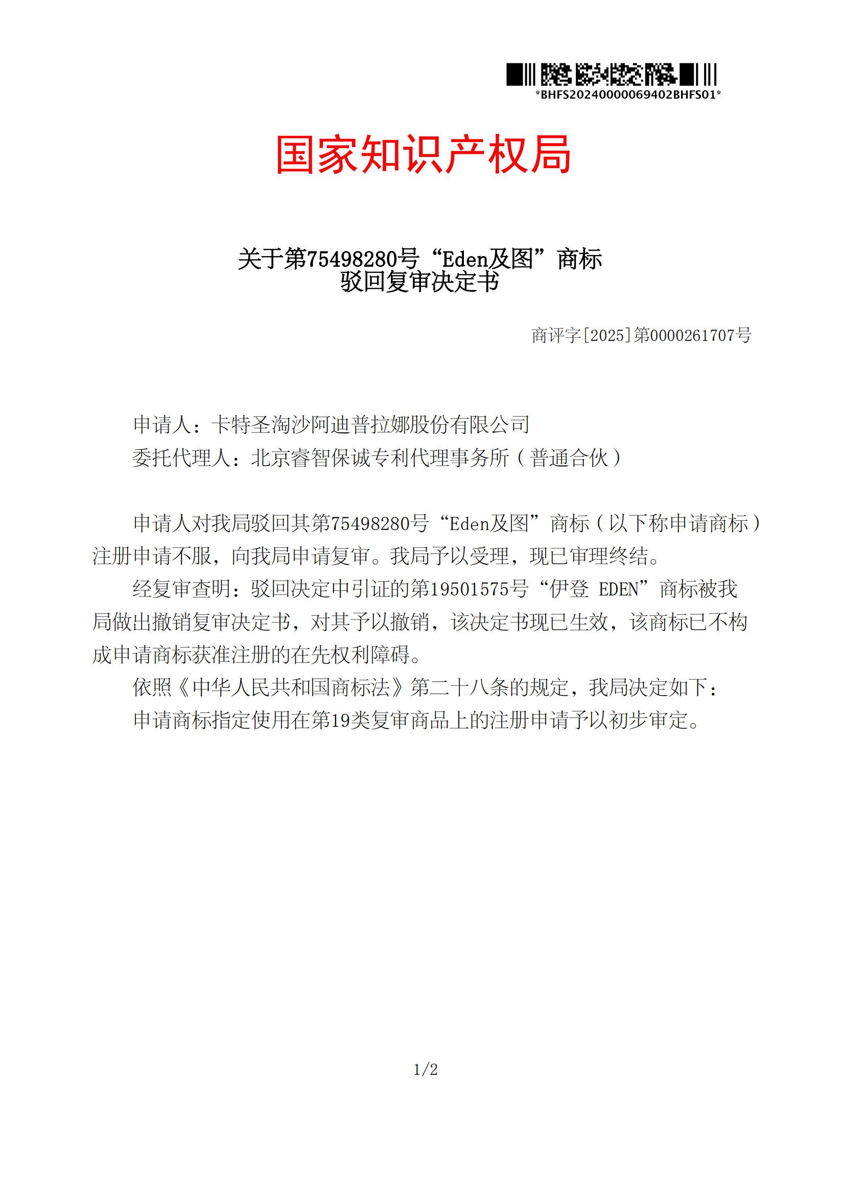 卡特圣淘沙阿迪普拉娜股份有限公司第19类75498280号“Eden及图”商标被驳回不服,根据《中华人民共和国商标法》第三十四条之规定,特委托我公司代理该商标的驳回复审事宜,并最终取得维权成功。