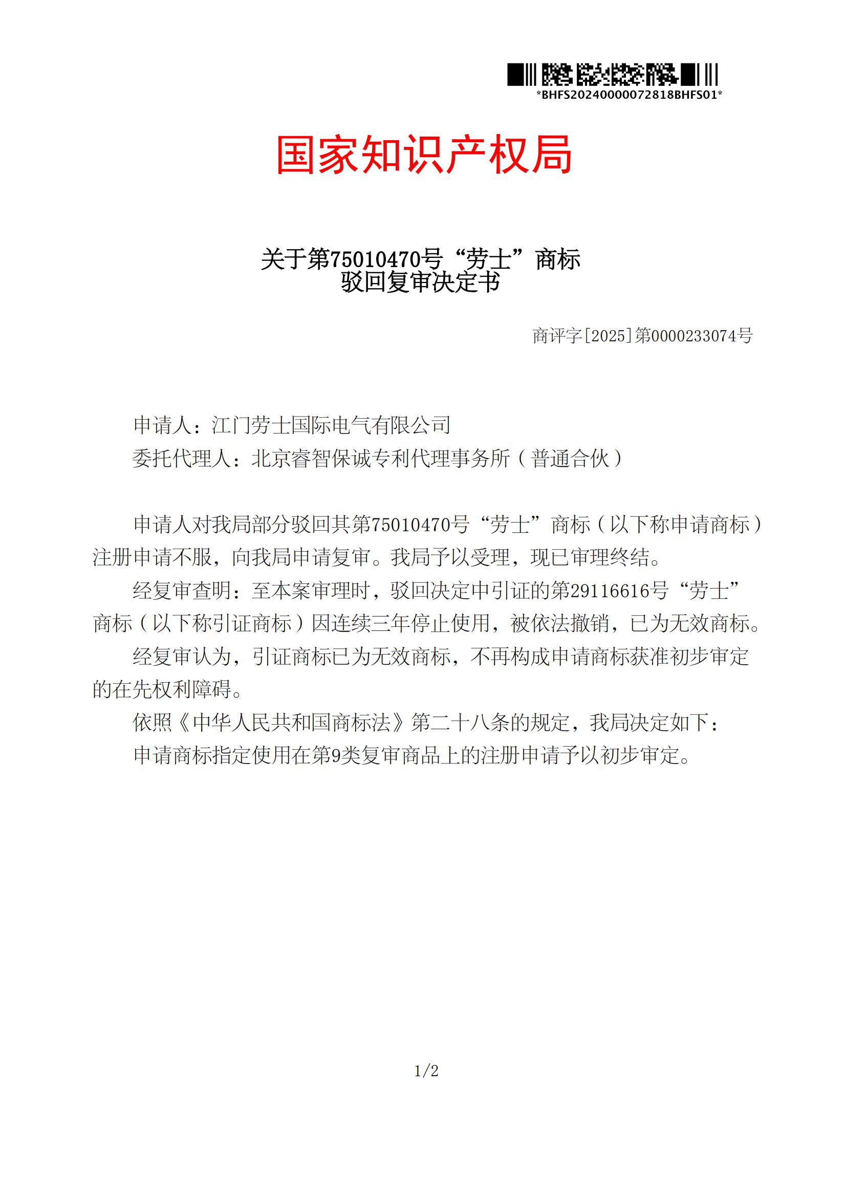 江门劳士国际电气有限公司第09类75010470号“劳士”商标被驳回不服,根据《中华人民共和国商标法》第三十四条之规定,特委托我公司代理该商标的驳回复审事宜,并最终取得维权成功。