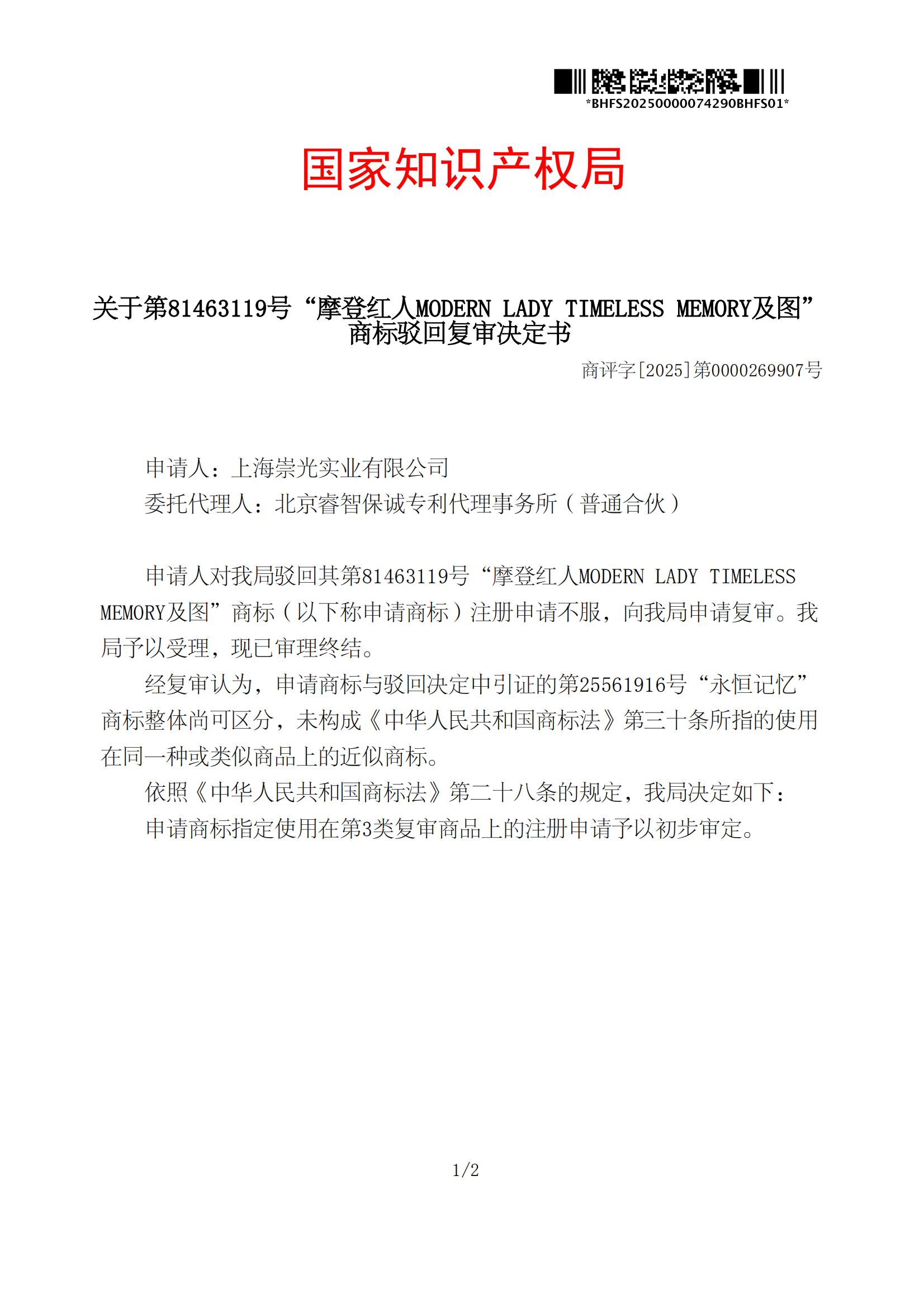 上海崇光实业有限公司第03类81463119“摩登红人MODERN LADY TIMELESS MEMORY及图”商标被驳回不服,根据《中华人民共和国商标法》第三十四条之规定,特委托我公司代理该商标的驳回复审事宜,并最终取得维权成功。