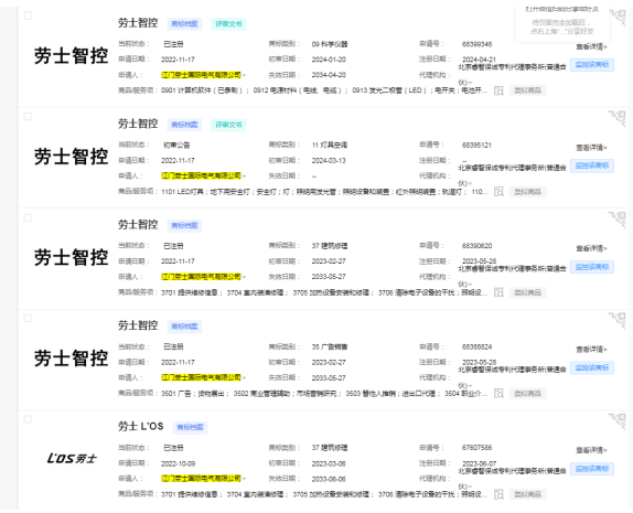 申请人在先初步审定和成功注册的部分商标截图如下: