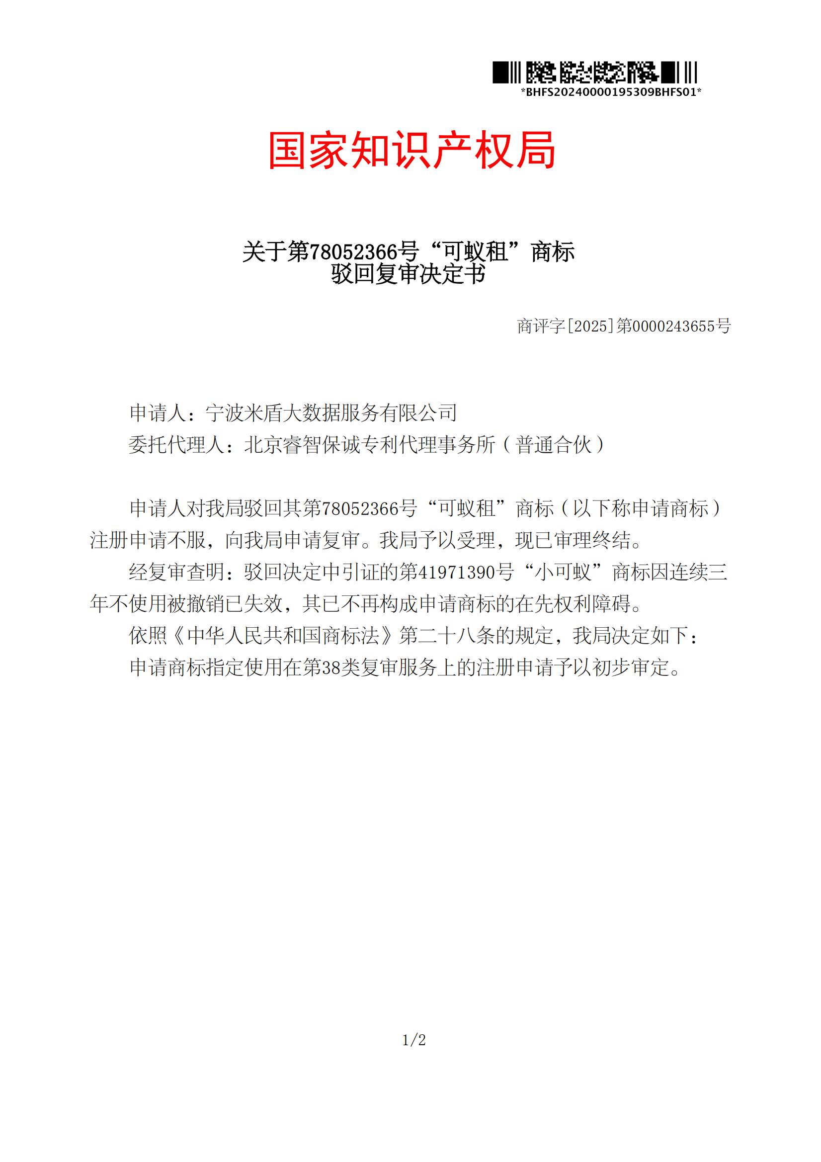 宁波米盾大数据服务有限公司第38类78052366号“可蚁租”商标被驳回不服,根据《中华人民共和国商标法》第三十四条之规定,特委托我公司代理该商标的驳回复审事宜,并最终取得维权成功。