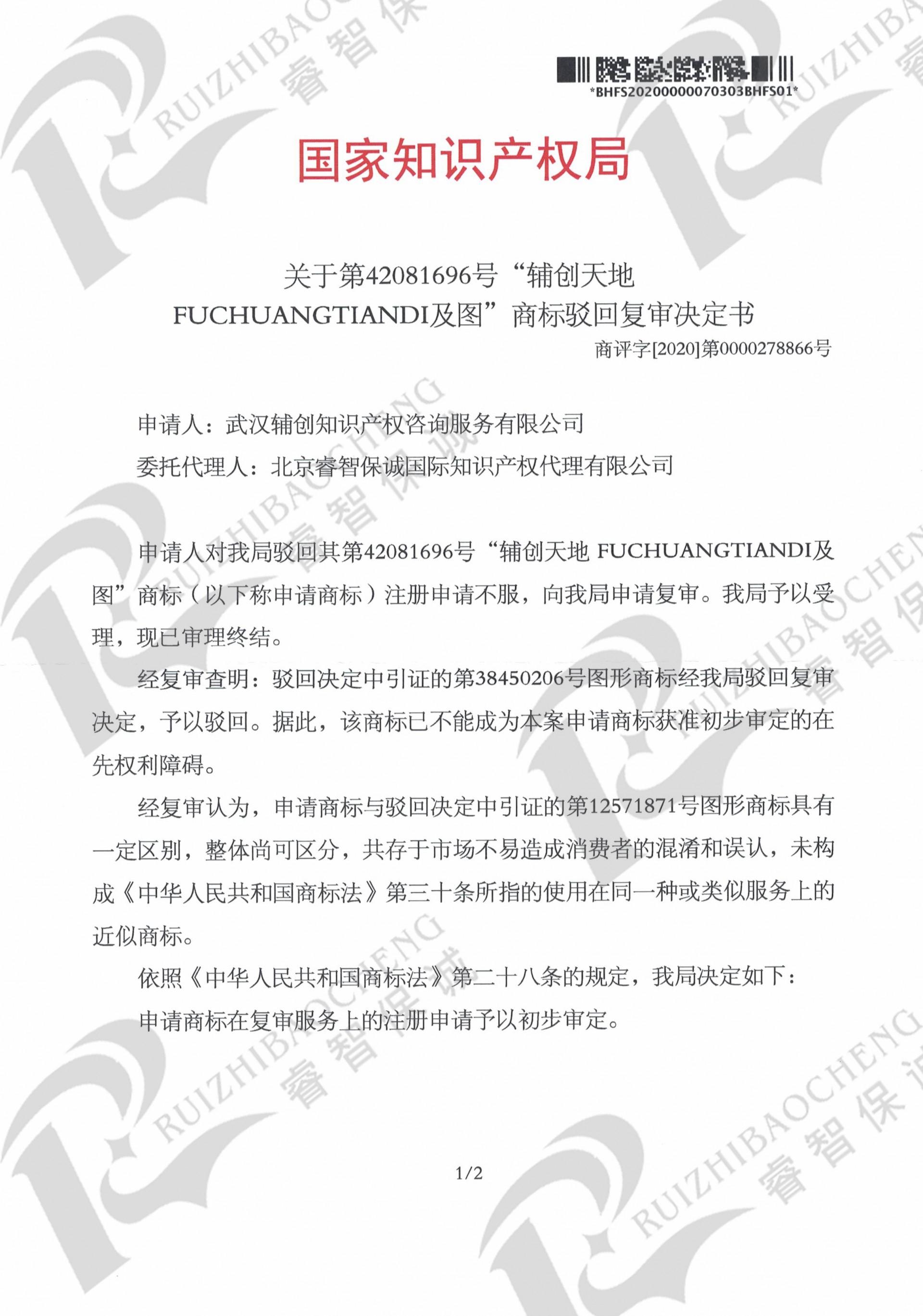 武汉辅创知识产权咨询服务有限公司对其注册在第35类的42081696号“辅创天地”商标被商标局驳回不服,根据《中华人民共和国商标法》第三十四条之规定,特委托我公司代理该商标的驳回复审事宜,并最终取得维权成功。
