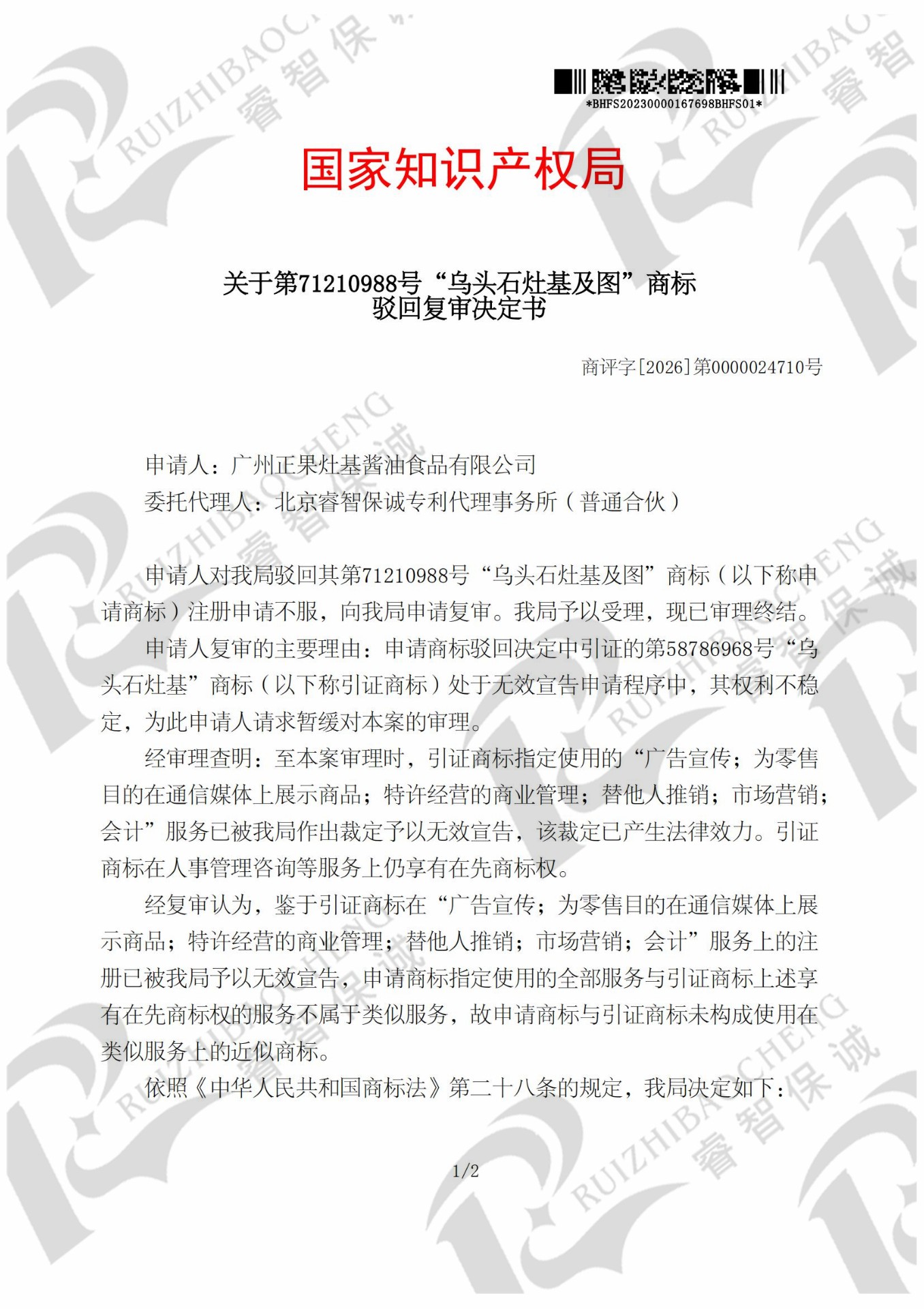 广州正果灶基酱油食品有限公司申请的第35类71210988号“乌头石灶基及图”商标被驳回不服,根据《中华人民共和国商标法》第三十四条之规定,特委托我公司代理该商标的驳回复审事宜,并最终取得维权成功。